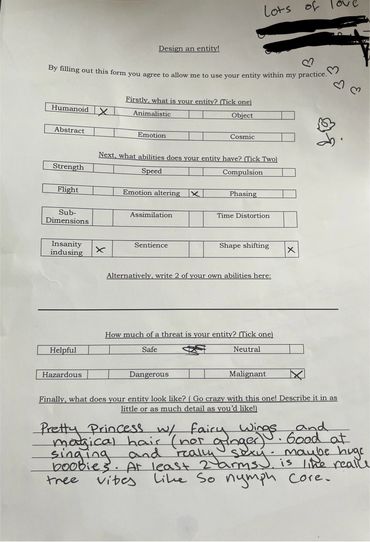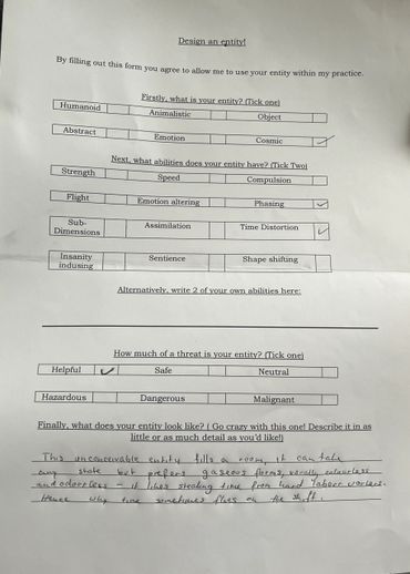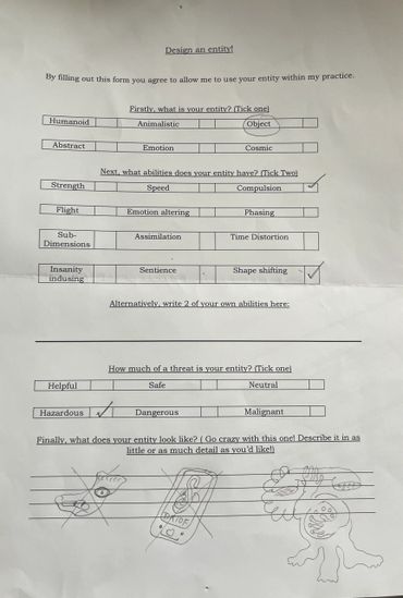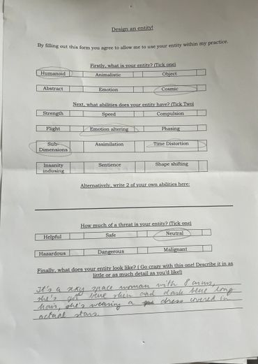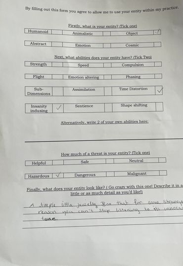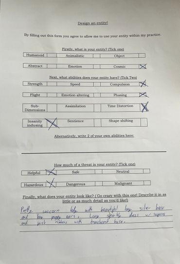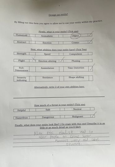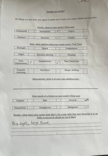 In order to achieve the feel of community and shared nightmares, I had the public design their own entities to be included in my game. I created a questionnaire with several sections, which can be seen above. I had around 10 responses, but I only used three in this version of the game. I used these prompts to create the entities below.